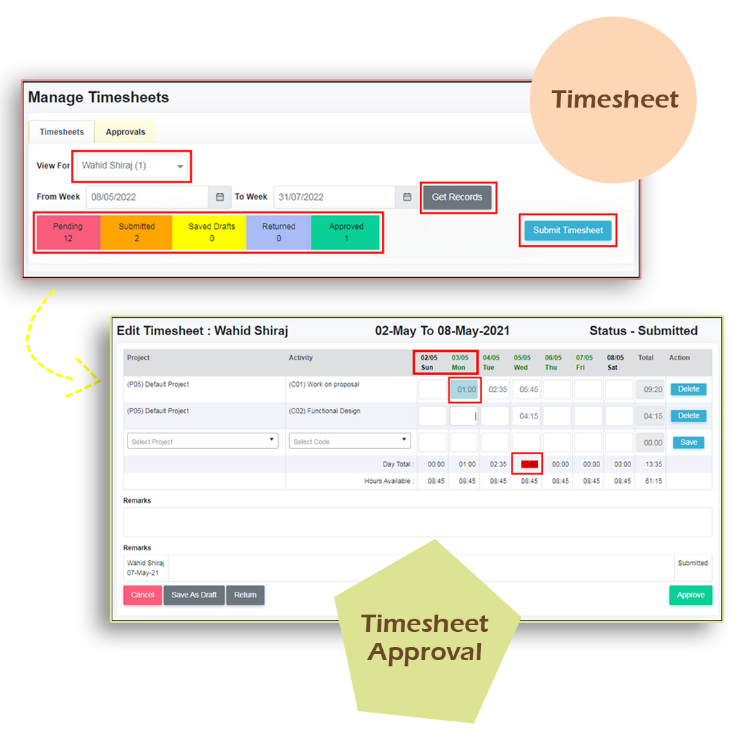 Choose between daily or weekly timesheet recording options. Control the workflows for updation & approval of timesheets.